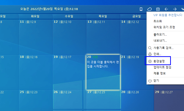 설치가 끝나고 컴퓨터 바탕화면을 보면 위 사진과 같이 바탕화면 달력이 바탕화면에 깔려 있는 걸 보실 수 있습니다. 다른 것처럼 아이콘을 클릭해야 뜨는 게 아니라 아예 바탕화면에 고정되어 있어 사용해 보시면 너무 편리하다는 것을 아실 수 있습니다.