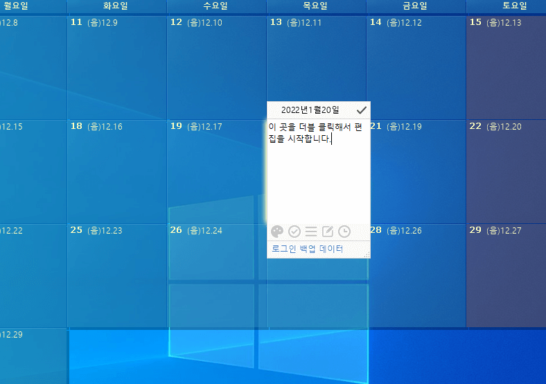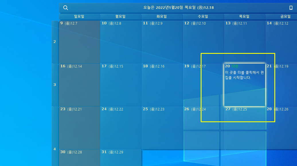 그런데 사무실에서 업무를 볼 때는 주로 컴퓨터로 일을 하다 보니 컴퓨터 화면 자체에 달력이 있으면 매우 편리합니다. 스티커처럼 앱을 열어야 사용할 수 있는 게 아니라 바탕화면 자체에 올려져 있어 매우 편리합니다.