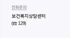 문의처 : 보건복지상담센터 전화 129. 보건복지상담센터에서 대한 자세한 설명은 보건복지상담센터 129를 참고하시기 바랍니다.