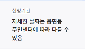 신청기간 : 자세한 신청기간은 거주하시는 읍면동 주민센터에 따라 다를 수 있으므로 주민센터에 직접 문의하시는 것이 좋습니다.