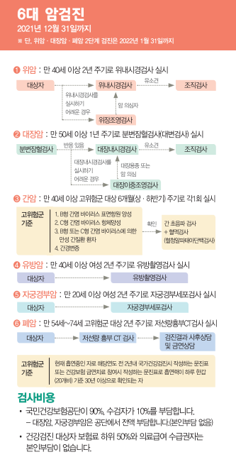 아울러 국가 건강검진을 받지 않은 상태에서 암이 발병한다면 암 환자 의료비 지원 사업의 혜택을 받지 못하게 됩니다. 우리나라 사람들이 가장 많이 걸리는 6대 암이 발병했을 경우 국가 건강검진을 잘 받은 이력이 있다면 본인 부담금으로 10%만 부담하면 됩니다.