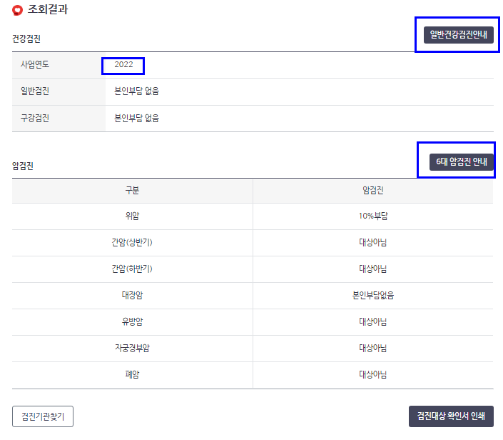 위 사진에서 보듯이 저는 2022년도에 건강검진 대상자로 나타납니다. 저 같은 경우는 일반건강검진과 위암, 대장암 검진에 해당합니다. 위암의 경우는 10%의 본인부담이 있고 대장암은 본인부담이 없다고 나옵니다.