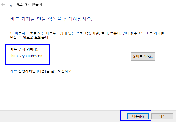 우리는 유튜브 바로가기를 만들려는 것이기 때문에 당연히 유튜브 주소를 입력해 줍니다. 그리고 <다음>을 눌러 줍니다.
