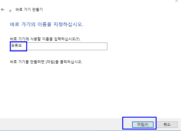 5. <마침>을 눌러줍니다. 마침을 눌러주면 첫번 방식으로 한 것과 같이 바탕화면에 유튜브 바로가기 아이콘이 생성됩니다. 이제 한번에 유튜브를 방문하실 수 있습니다.