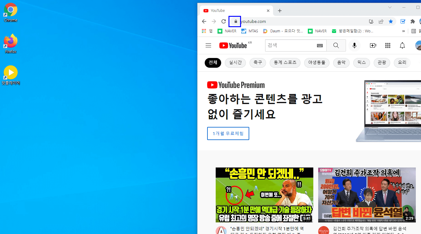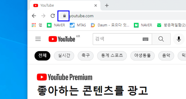 2. 그리고 유튜브 주소창 맨 앞에 있는 자물쇠에 마우스 화살표를 위치시키고 마우스 왼쪽을 누릅니다. 위 사진의 네모박스 안 부분에 자물쇠가 있습니다. 아래는 그 부분을 확대한 사진입니다. 자물쇠가 보이시죠?