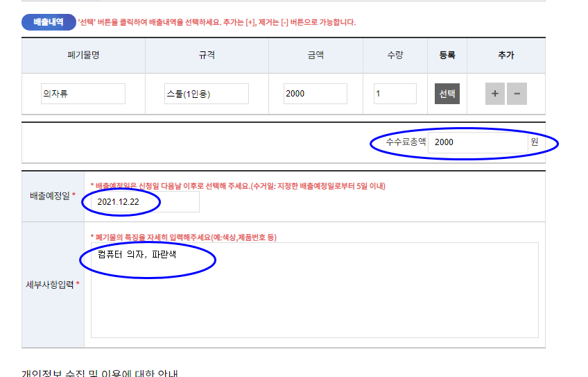 그래서 간단하게나마 폐기물의 특성을 알 수 있게 기재해 줍니다. 예를 들어 '오른쪽 앞다리 파손' 등 다른 물건과 구별되는 특징을 적어주면 됩니다.