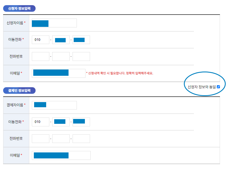 * 신청자 인적 정보를 입력 -> 결제인 정보 입력(신청자와 동일인일 경우 체크) -> 배출장소 입력 -> 폐기물 종류 선택