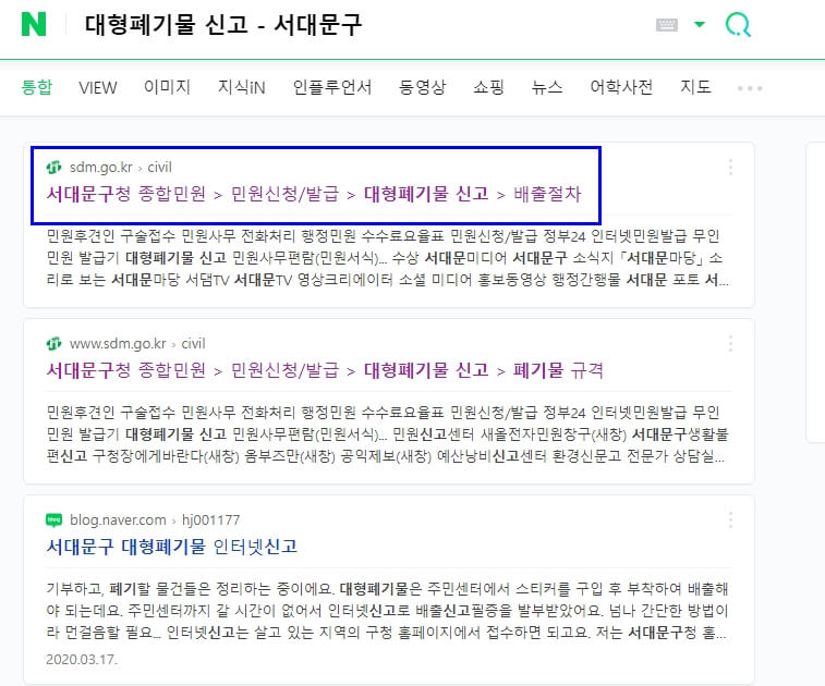 네이버나 다음에서 '대형폐기물 신고 -00구'로 검색합니다. 그러면 위 사진과 같이 관할 구청의 폐기물 신고하는 사이트가 나타납니다. (그냥 관할 홈페이지를 방문해서 '폐기물'이라고 검색해도 됩니다.)