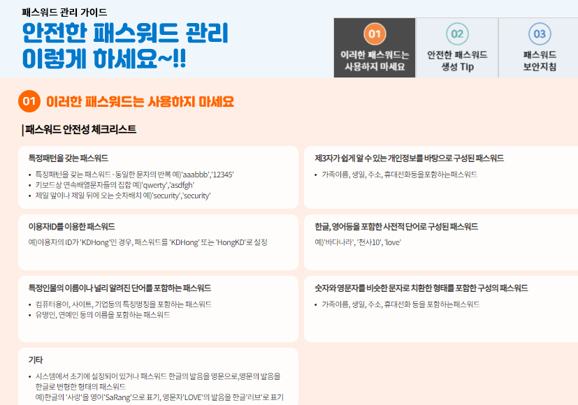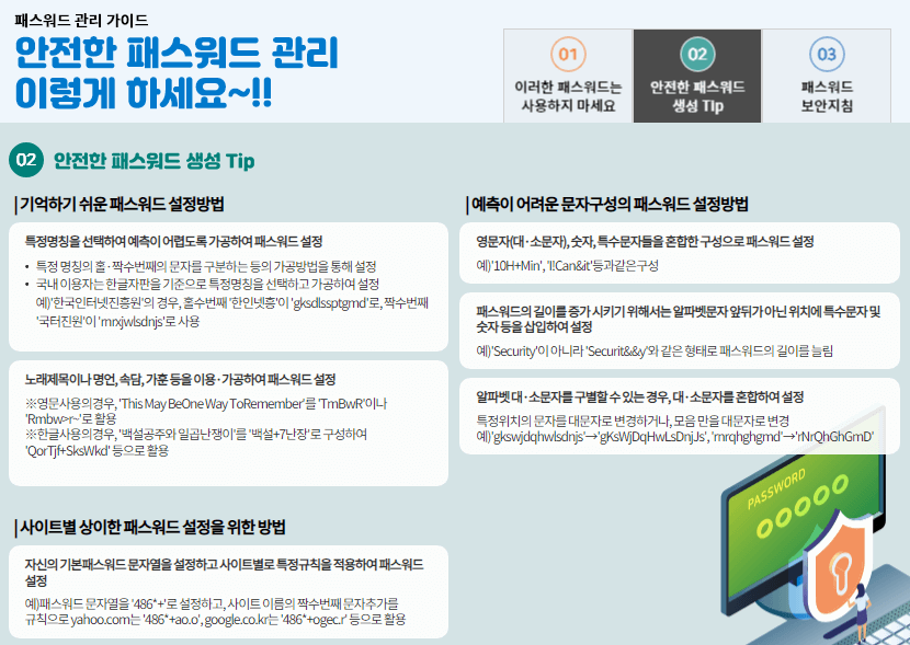 털린 내 정보 찾기 서비스를 이용하면 안전한 패스워드 관리에 대해서도 좋은 방법을 아실 수 있습니다. 아래 사진의 내용을 참고하시기 바랍니다.