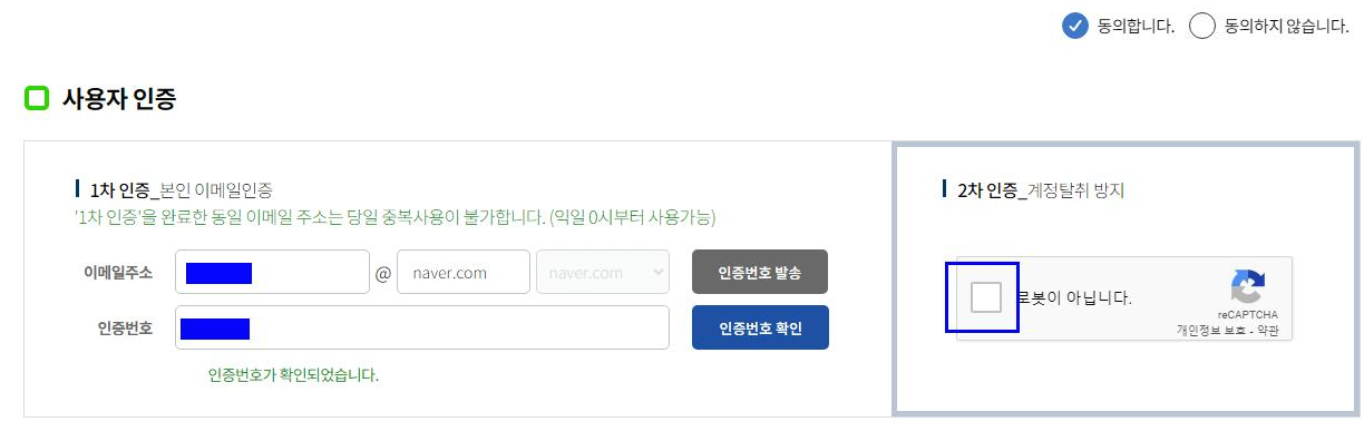 인증번호가 확인이 되면 우측에 리캡챠 확인이 또 뜹니다. 인증을 확실하게 하네요.