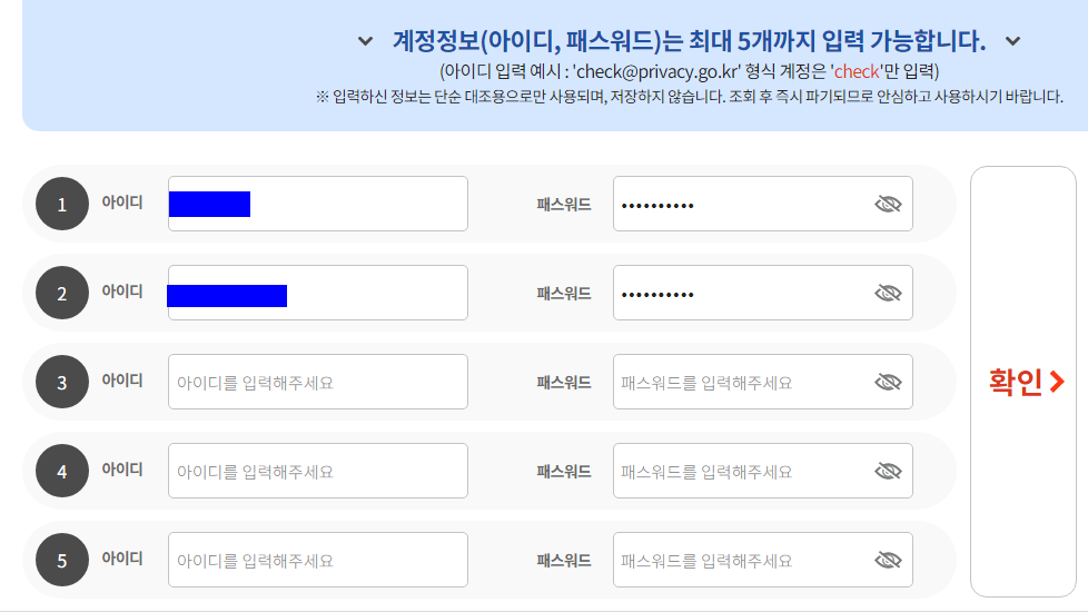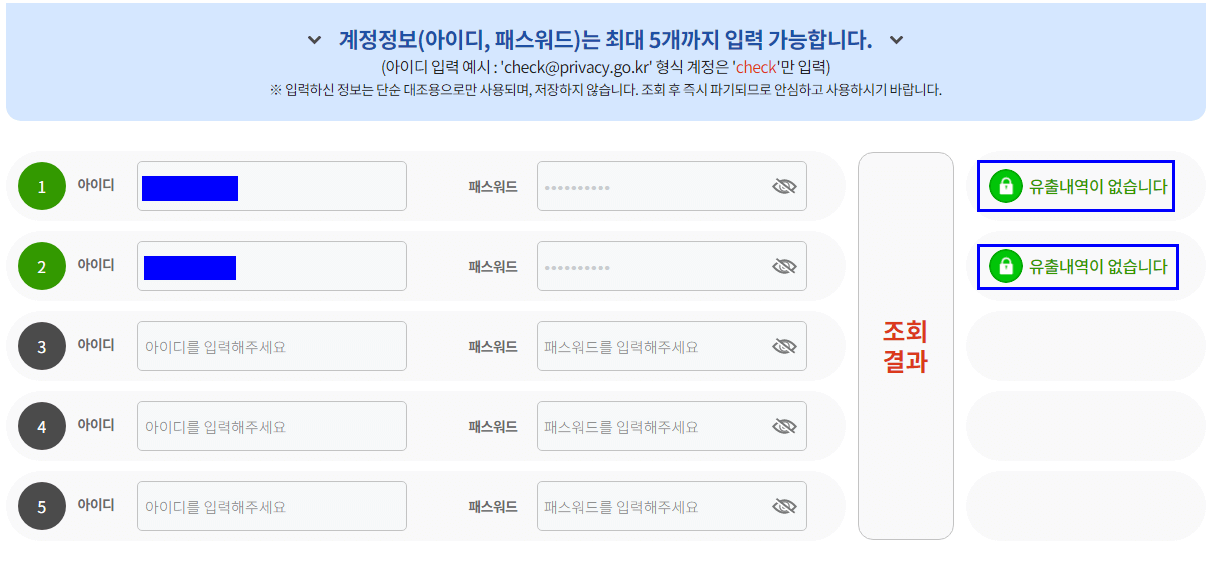 리캡챠까지 체크해 주고 나면 털린 내 정보 찾기 서비스 화면이 나타납니다. 아이디를 최대 5개까지 입력하여 조회할 수 있습니다. 보통 아이디는 하나나 둘을 사용하실 겁니다. 더 된다면 5개까지 가능하니 최대한 기억나는 대로 5개까지 다 기입해 봅니다.