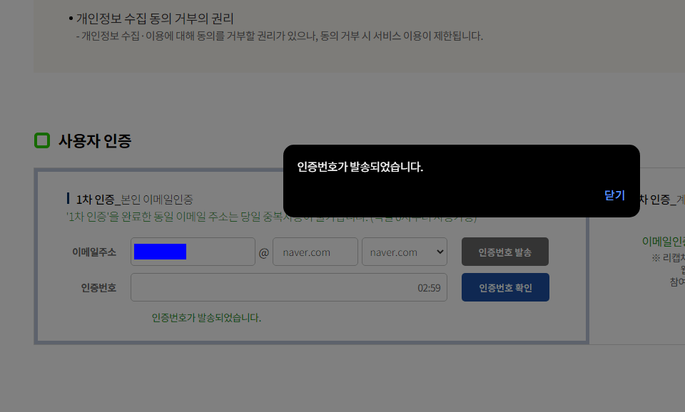 이메일 주소를 기재하고 '인증번호 발송'을 눌러주면 기재한 이메일로 본인 인증 번호가 배달됩니다.
