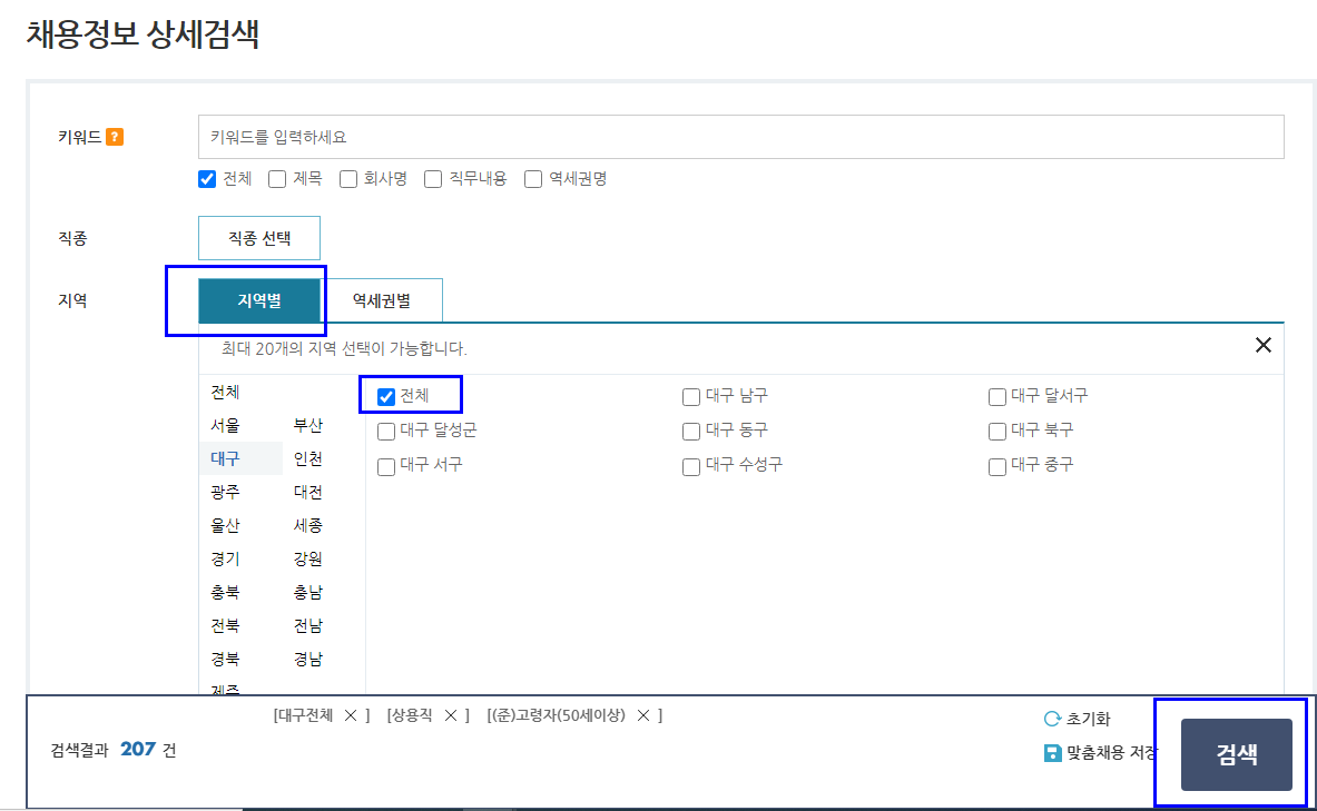 숫자 부분을 클릭해 주면 구인 정보 상세 조회 페이지로 넘어갑니다. 여기서 위 사진처럼 '지역별'을 클릭해 줍니다. 그러면 사진과 같이 아래로 지역 이름이 나타납니다. 여기서 본인이 거주하는 지역을 클릭하시고 검색을 하면 해당 지역의 구인 정보를 보실 수 있습니다. 아래 순서로 해주시면 됩니다.