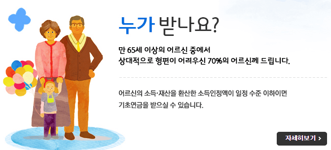 누가 받나요? 기초연금 수급대상자 안내 및 소득인정액 산정방식에 대한 자세한 설명을 볼 수 있습니다. 대상자 안내 기초연금은 만 65세 이상이고 대한민국 국적을 가지고 계시며 국내에 거주(