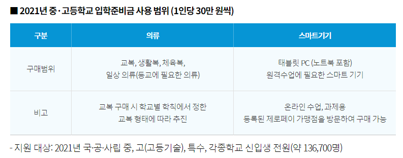 금액 : 초등학교 신입생 20만 원, 중학교, 고등학교 신입생 30만 원.